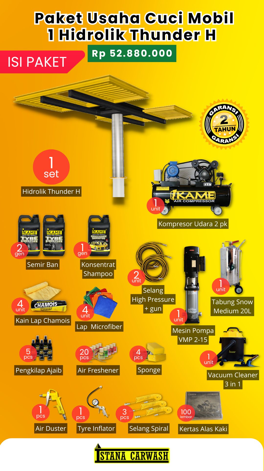 Ingin usaha cuci mobil berkualitas dengan peralatan terbaik? Dengan IKAME Thunder H, kamu bisa memulai bisnis cuci mobil yang profesional dan menguntungkan! Cek harga paket lengkap hidrolik kami: